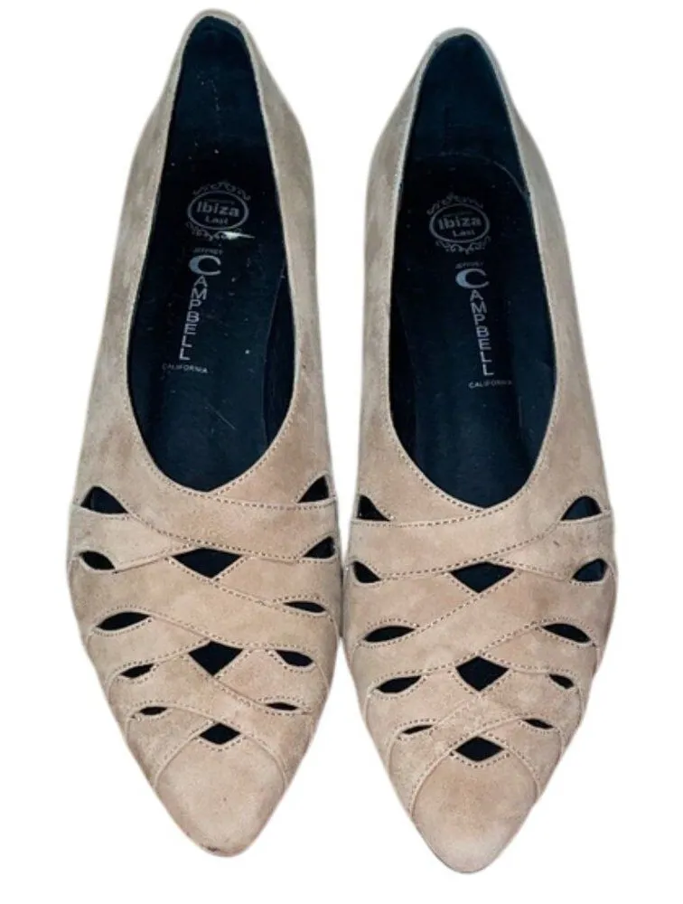 Tan brown, suede leather, handmade Ibiza Last, pointed toe, low wedge heel pumps, shoes by Jeffrey Campbell in women's size 9. Woven, cutout design on vamp. Clean insoles. Soles have little to no signs of wear as do uppers. The shoes almost look like new but there is a problem with the heel tap of the right shoe. The taps are supposed to slope at an angle to match the curve in the heel but it has broken off on the right shoe. See photo. It is still wearable as is and not very noticeable. It should be a very inexpensive repair by a cobbler should it bother you. Pre-owned.