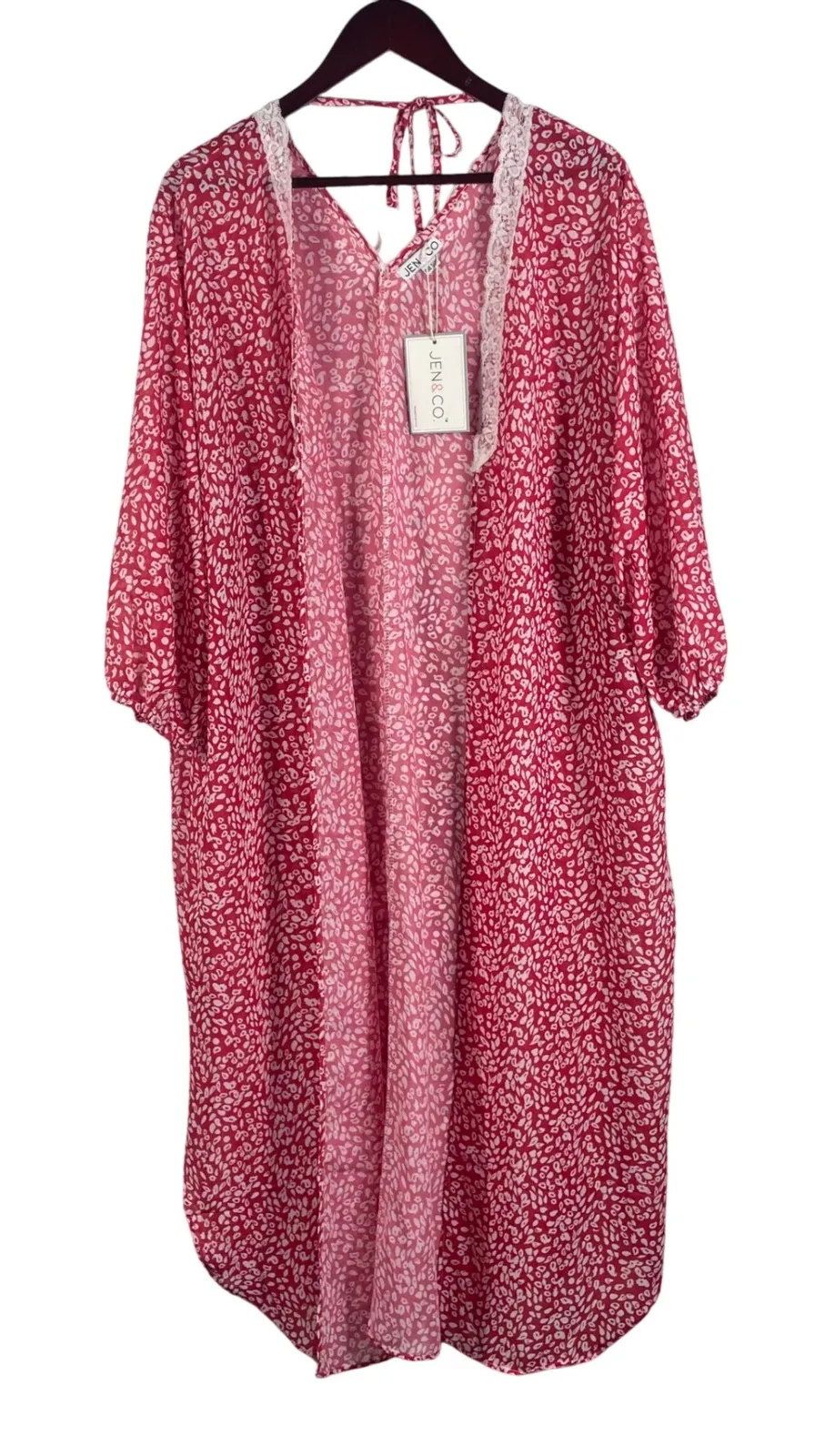 Add effortless bohemian style to your wardrobe with this Jen & Co. lightweight kimono cover-up, designed in the USA and PETA-approved vegan. Featuring a soft pink and red abstract floral print with delicate lace trim and a tie at the neckline, this flowy piece works beautifully as a beach cover-up, layering kimono, or lounge topper. • Style: KM2116-PAIS.HPK • Color: Hot Pink / White pattern • Material: Lightweight woven fabric (100% vegan materials) • Elbow-length sleeves with gathered cuff • Flowy, relaxed fit • Designed in the USA • PETA-approved vegan Condition: New with tags (NWT) Measurements (approximate, laid flat): • Length: 39" • Sleeve length: 17" • Width (pit to pit, flat): 25" Jen & Co kimono, pink lace trim kimono, vegan clothing, boho resort cover up, beachwear, NWT kimono, lightweight robe, vacation outfit, PETA approved, casual layering top, spring summer wardrobe