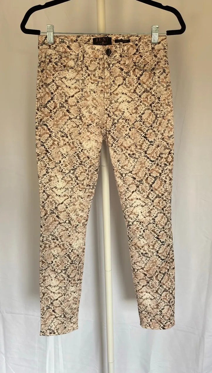 Unleash your wild side with these striking JEN7 ankle skinny jeans, designed to turn heads with their captivating snake print. Crafted for a flattering silhouette, these jeans hug your curves for a comfortable and chic look that moves with you. Their versatile design makes them ideal for a night out with friends or a stylish addition to your everyday wardrobe. Measurements: • Waist: 13.5-16" • Inseam: 26.5" • Rise: 10" Style: Skinny Department: Women Accents: Zipper, Logo Type: Jeans Features: Pockets, Comfort Fit: Slim Pattern: Animal Print Rise: Mid (8.5-10.5 in) Fabric Type: Denim Keywords: JEN7 jeans, ankle skinny, snake print, animal print, neutral print, statement denim, fashion jeans, contemporary style, designer denim, chic pants, trendsetter, all-season wear