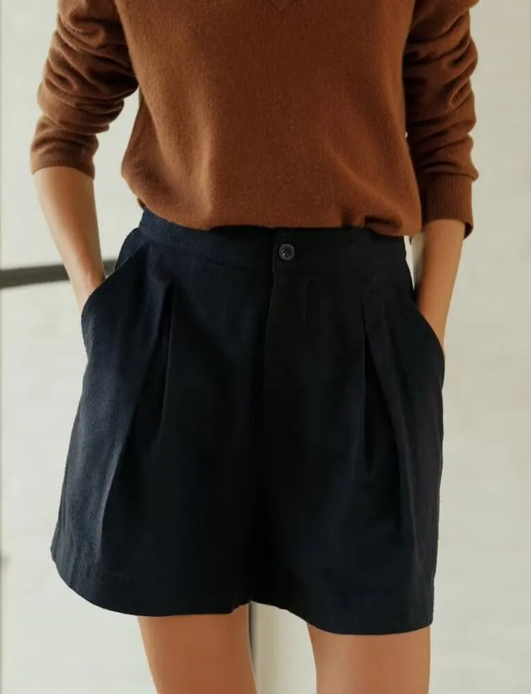 Jenni Kayne Pleated Trouser Shorts Black Size 14 100% textural raw silk, has a nubby linen like fe... Show more