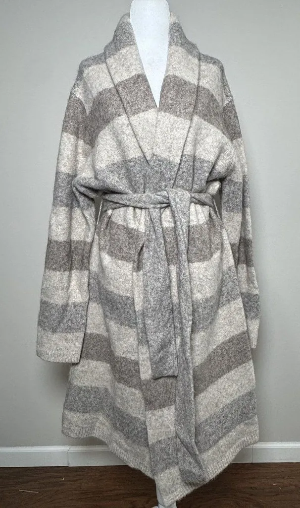 +++EXCELLENT CONDITION+++ NEW ++RETAIL PRICE $425++ ****Reasonable offers are welcomed**** Before you buy a garment, please ask me any questions you may have and I will immediately answer them. Take a look at all the photographs of the listing. I can share more photographs and/or more information, just send me a message, here to help. I ship the same day with no exceptions depending on what time the order comes in :) *Top to bottom = 39 inches Armpit to armpit = 25 inches This wool-blend cardigan coat features a sophisticated striped design, exuding comfort and timeless style. Its shawl collar and belted waist enhance its classic charm. The soft material and long sleeves make it ideal for cooler seasons, providing warmth and elegance, while the neutral gray and cream stripes offer versatile pairing options. • Shawl collar design for added style • Adjustable tie belt for a customized fit • Long sleeves for extra warmth • Mid-thigh length for a flattering silhouette • Soft wool-blend material for comfort Jenni Kayne Belted Sweater Chic Coat Cardigan Womens XL Striped Longline Pockets