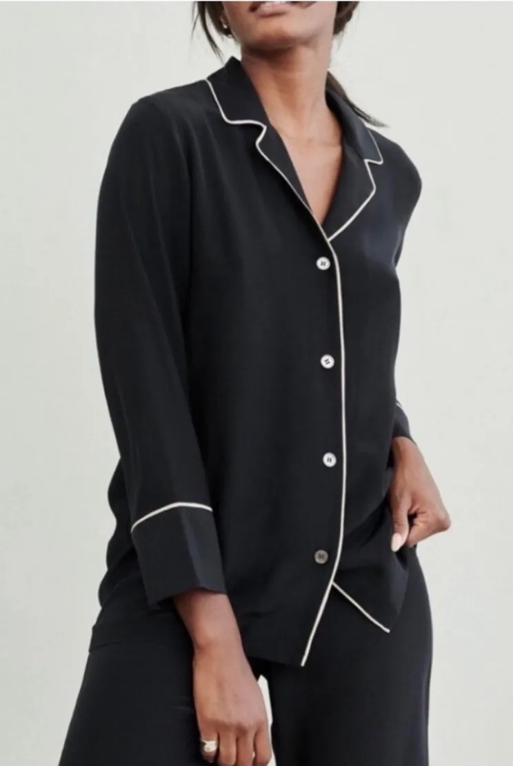 Excellent used condition. Jenni Kayne black silk pajama shirt with contrast piping. Classic collared... Show more