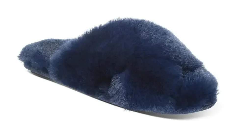 New in box, Jenni Slippers Crisscross Faux Fur Slide Size Small 5/6 Color Navy Blue Sail. loungewear perfect gift Product details Plush and fuzzy, slip on the total comfort of these crisscross faux-fur slippers from Jenni.