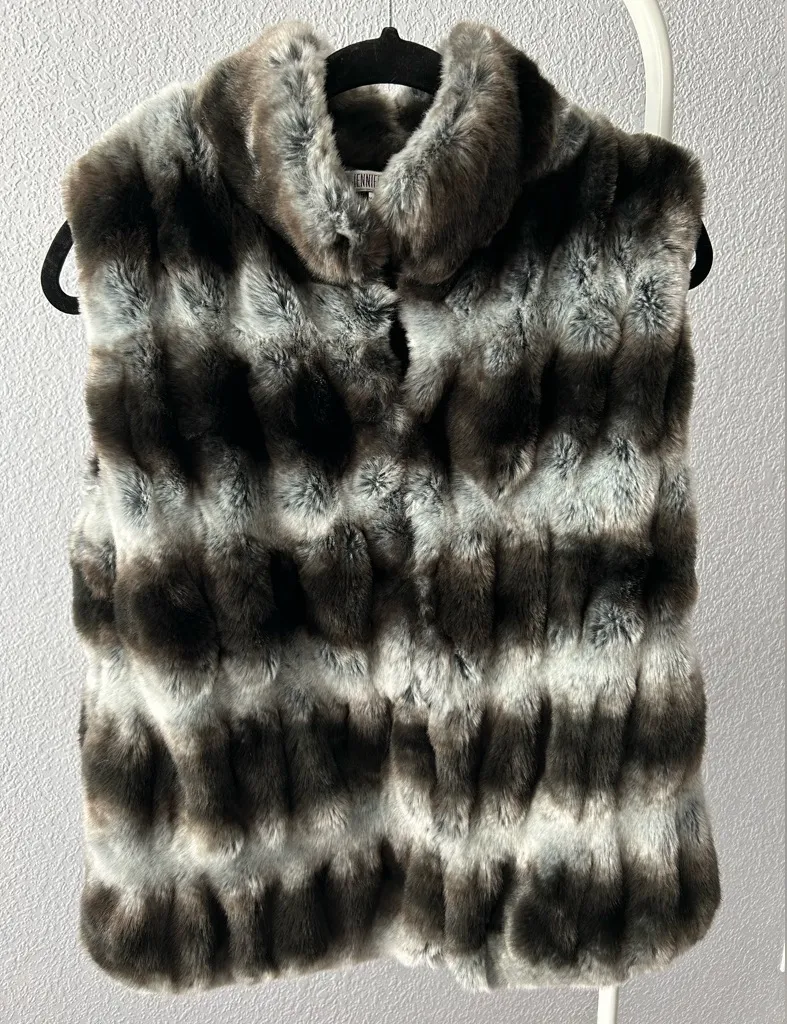 Luxurious faux fur vest. Features a blend of brown and gray tones. Perfect for layering.