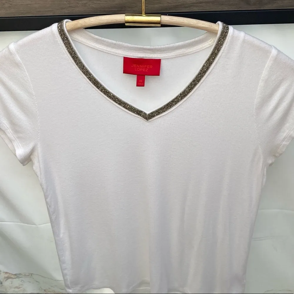 Excellent preloved condition - Women’s Luxe Embellished Ribbed V-Neck Tee Shirt by Jennifer Lopez lu... Show more