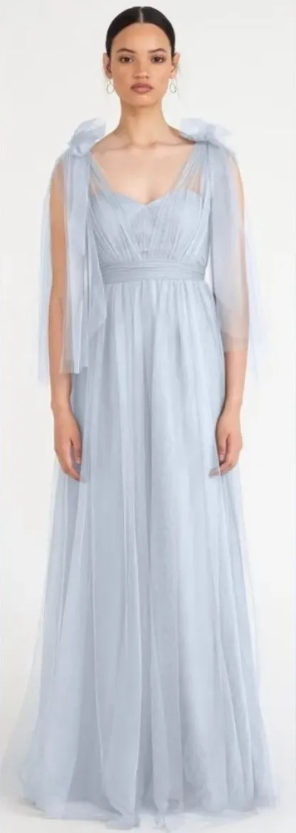 Enchanting elegance cascades in this Jenny Yoo gown. Airy tulle dances around a fitted bodice, creating a silhouette that feels both ethereal and flattering. A graceful V-neckline and optional shoulder ties add versatility, while the flowing maxi skirt ensures graceful movement. This gown makes a perfect choice for bridesmaids, formal galas, or a sophisticated evening event. Does not have tulle attachment. In perfect condition otherwise. Measurements: • Bust (pit to pit): 14 inches • Length: 50 inches Material: Polyester Keywords: Jenny Yoo, Bridesmaid dress, Tulle gown, Maxi dress, Formal dress, Evening gown, Powder blue dress, Wedding guest dress, Party dress, Special occasion dress, Prom dress, V-neck dress, A-line dress, Tulle maxi gown Ships fast from pet & smoke free home. offers welcome! Please review all photos.