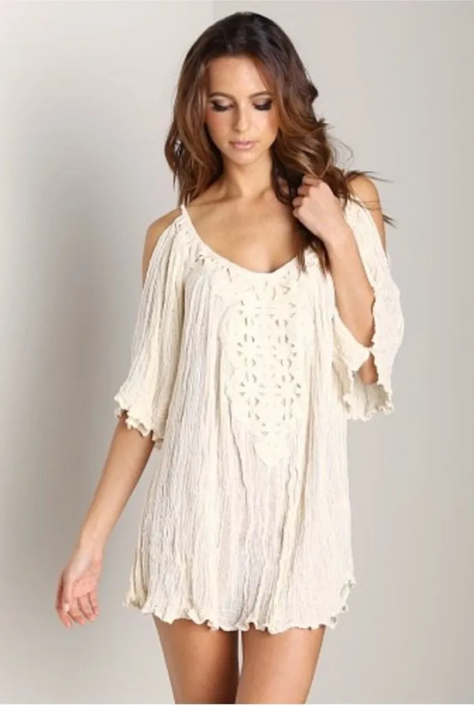 Jen’s Pirate Booty Womens Tunic Dress One Size Dahlia Tunic Mini Dress Neutral cream beige color Gauzey texture 100% Cotton Open shoulders w flowy sleeves Embroidered design on chest Scoop neck Flowy breathable Relaxed fit Perfect for beach cover up, summer dress or pair with shorts Preowned good condition no flaws Approx Measurements Laying Flat Pit to pit- 21” Length- 33/34”