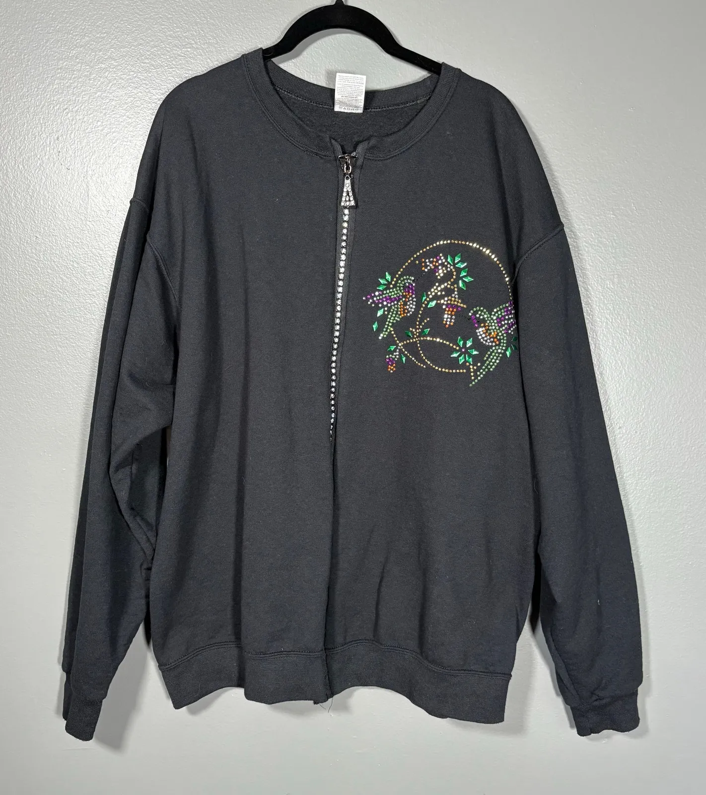 Women's rhinestone hummingbird jacket by Jerzees Nublend. This black sweatshirt has a full zip clos... Show more