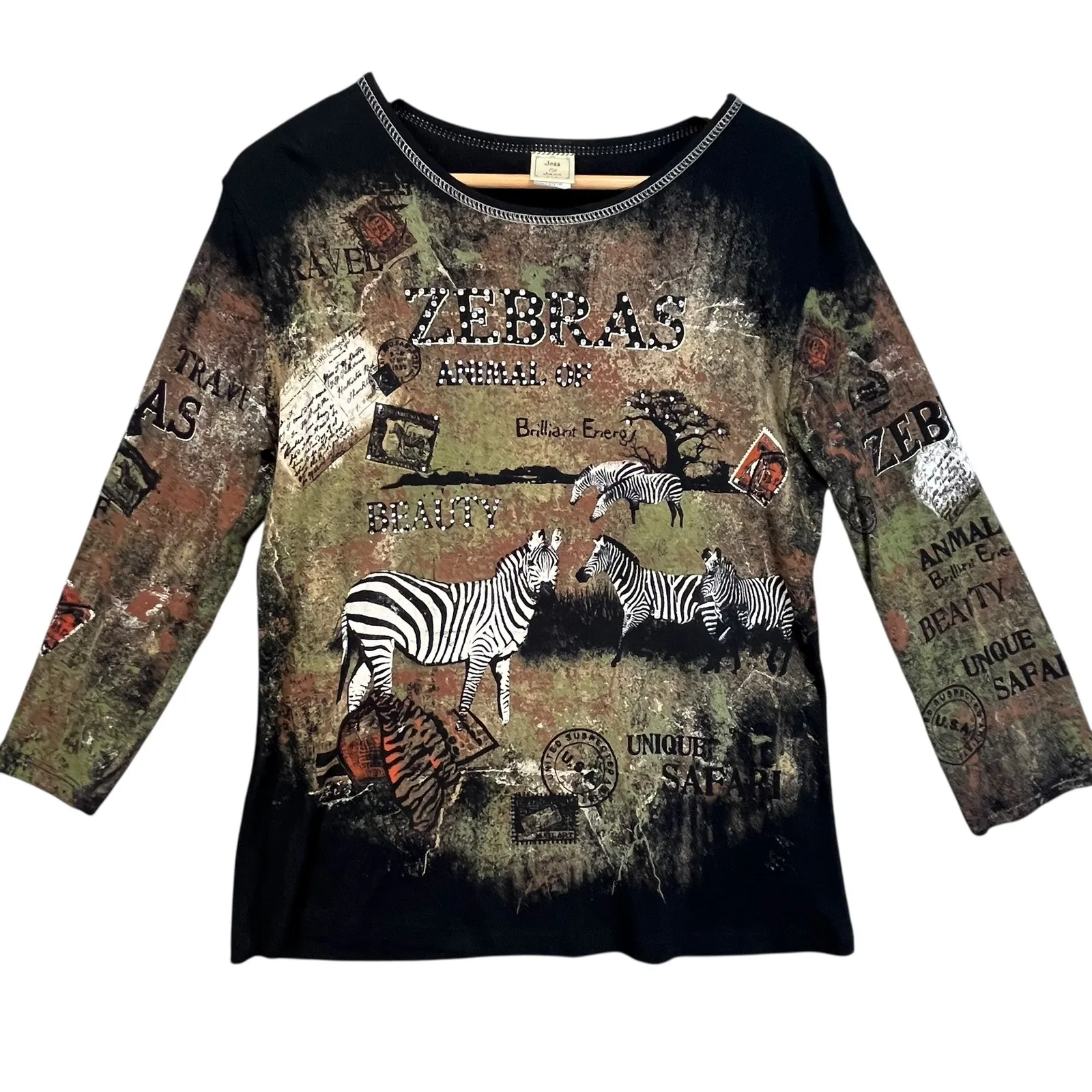 Bold and artistic, this Jess & Jane top features a safari-inspired zebra motif with mixed graphic elements, rustic tones, and a travel journal aesthetic. Made in the USA from 100% cotton, this comfortable medium-weight tee. A unique piece for lovers of wildlife, adventure, and statement style. Item Details: • Brand: Jess & Jane • Style: Zebra Graphic Tee • Size: Medium • Material: 100% Cotton • Made In: USA • Condition: Excellent pre-owned • Measurements (inches, appro): • Bust: 20" • Length: 24.5" • Sleeve: 18.5" Ships in 1-2 business days.