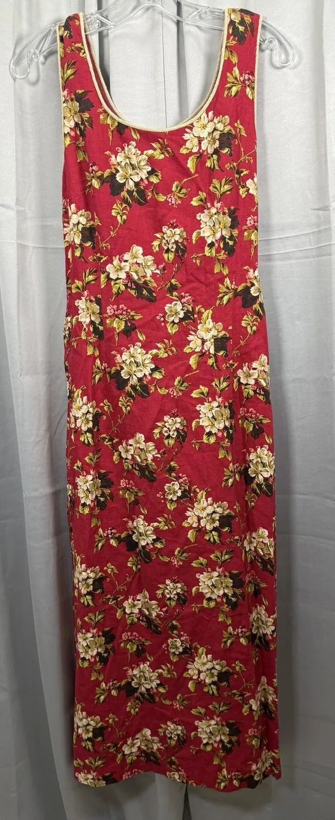 Brand: Jessica Howard Womens sleeveless midi dress in a rich red floral print with ivory blossoms, green foliage, and subtle black accents. Tag size: 10 Shell fabric: 55% Linen, 45% Rayon Lining: 100% Polyester (fully lined) Neckline/Back: Scoop neck and scoop back with contrast piping trim Features: Back self-tie waist for an adjustable, flattering fit Care: Dry clean only Label details: RN 70643; Made in China (per tag) Notes: Classic floral styling with breathable linen-rayon blend; great for spring/summer events. Fit note: Sizing can vary by brand; please compare to a similar dress for best fit.
