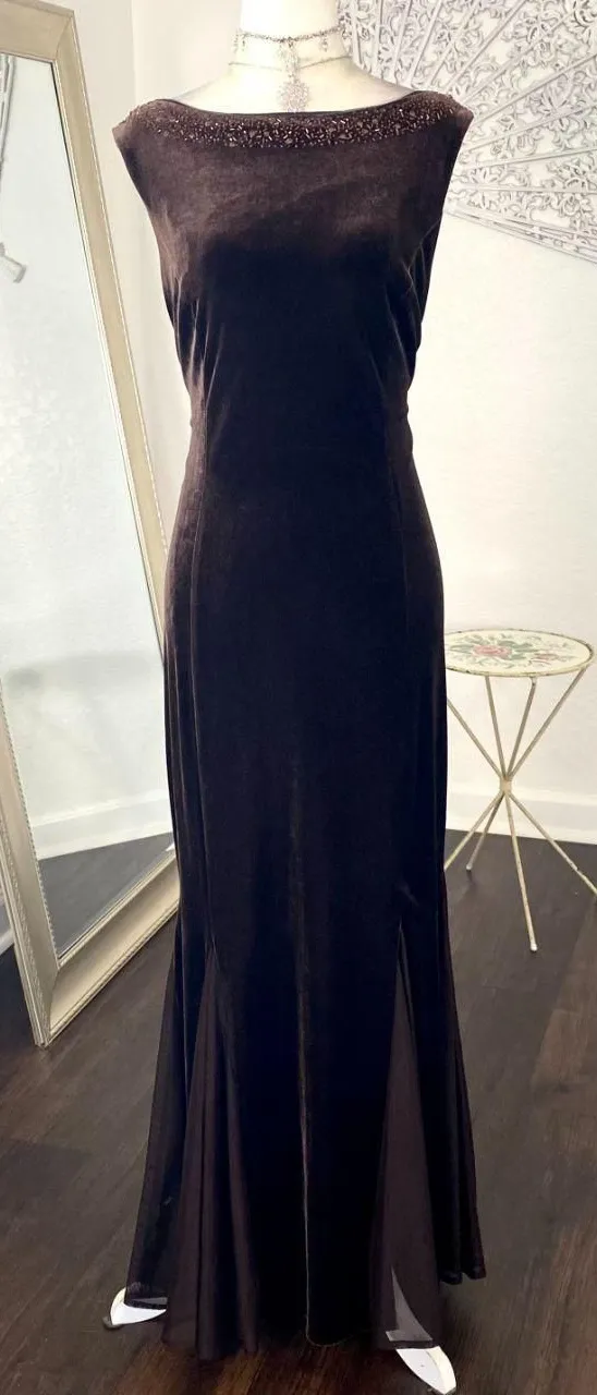💗 Early 2000's Whimsygoth Beaded Velvet Prom Maxi Dress 💗 ༓ Brand: Jessica Howard ༓ size: 14 / L ༓ stunning dark soft velvet dress, trumpet skirt with flowy mesh inlays, brassy gold beading on U-neckline and on deep v-neck in back ༓ zipper in back ༓ such ethereal romantic goth bohemian fairy vibes, a Y2K dream formal gown Measurements: ༓ pits 19" ༓ single waist 16.5" ༓ length: 54" Tags: #whimsical #whimsygoth #fairy #bohemian #ethereal