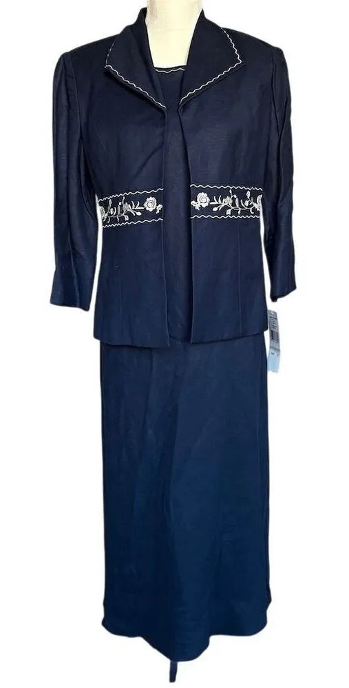 This Jessica Howard dress is a size 6, regular fit, and features a midi-length design in blue. It is crafted from a linen blend of linen and rayon, offering a comfortable and elegant feel. The dress is sleeveless with a round neckline and includes a 3/4 sleeve jacket, making it suitable for formal occasions such as weddings or cocktail parties. The embroidered pattern adds a touch of sophistication, and the dress is fully lined for added comfort. It has a button closure and is made in China. The garment requires dry cleaning. The dress is new with tags. Brand: Jessica Howard Size: 6 Style: E63019 Dress length: Knee Length Color: Blue Department: Women Pattern: Embroidered Sleeve length: Sleeveless Occasion: Formal Material: Linen, Rayon Fabric type: Linen Blend Theme: Elegant, Formal Neckline: Round Neck Season: Spring Sleeve type: 3/4 Sleeve Closure: Button Accents: Embroidery Features: 2-Piece Set, Lined Country/region of manufacture: China Garment care: Dry Clean Only Measurements upon request 0860
