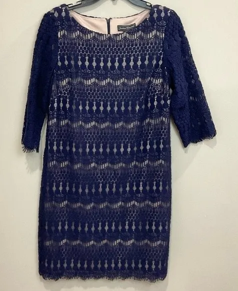 Jessica Howard Navy Evening Layered Lace Shift Dress Navy lace & nude lining layered dress Scalloped fringe hem 3/4 sleeve Zipper back closure with hook & eye at top Falls just above knee Size: 12 petite Approximate measurements Width under arms: 17.5" Length: 35" Great pre-owned condition Evening * cocktail * party * event * Lace * Shift * Night Out * Theatre * Concert * ceremony * petite * fall * wedding guest * mother of the bride