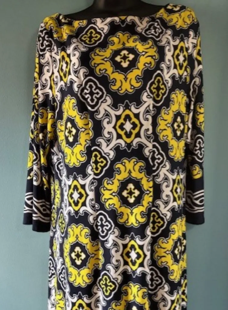 The Jessica Howard Women's Dress in size 16 features a navy blue and yellow geometric pattern, making it a bold and bright choice for various occasions such as travel, weddings, parties, or casual events. The knee-length shift dress has a 3/4 bell sleeve and a round neck, with a pullover closure for easy wear. Made from a blend of polyester and spandex, this lightweight and stretchy dress is easy to care for with machine washable fabric. Its artistic and eye-catching design, along with its asymmetrical accents, make it a versatile and stylish addition to any woman's wardrobe. Excellent like brand new condition! 20 inches from arm pit to arm pit 38 inches in length 19 inch sleeve 21 inches from neck to end of sleeve