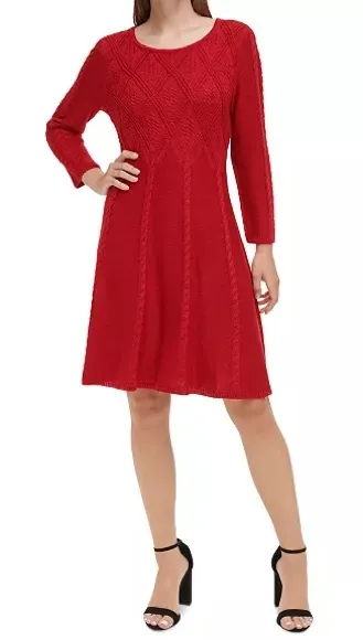 New with tags Jessica Howard Cable-Knit Fit & Flare Sweater Dress Color: Red Look chic in colder weather with this cable-knit sweater dress from Jessica Howard. Approx. 34-1/2" long from center back neck to hem Fitted through the chest and waist; flared and flowing skirt Round neckline; Fit & flare silhouette Pullover styling Long sleeves Unlined Acrylic Women's Size Small