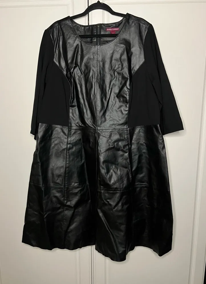 Jessica London fit and flare 100% leather dress with stretch black panels at the sides and at the sleeves for comfort. Zip at back. No flaws. Pit to pit 25” Waist 23.5” Length 41”