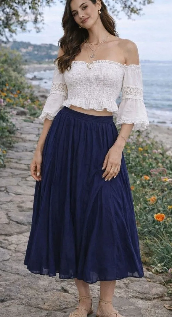 cottagecore, coastal, romantic, soft flow, effortless elegance, boho classic Beautiful Jessica London midi skirt in a deep navy hue with a softly crinkled, flowing silhouette. Designed with an easy elastic waist, this skirt drapes effortlessly and moves with a light, airy feel. Perfect for casual days, coastal styling, or romantic cottage-inspired looks, it pairs effortlessly with blouses, knits, or breezy tops for year-round wear. • Brand: Jessica London • Color: Navy • Pattern: Solid crinkled texture • Style: Midi skirt • Size: Women’s 22W