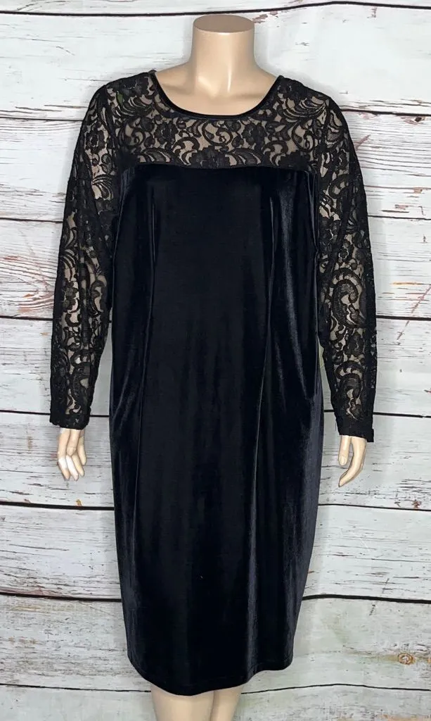 Jessica London Size 24 Black Velvet Dress. Lace Trim. Back Keyhole with Button Closure. Back Zipper Closure. Long Sleeves. Polyester/Spandex Blend - Lace is Nylon/Cotton Blend. NWT, Brand New with Tags. Length is 44.5” & Bust is 24”. Measurements taken while garment is laying flat.