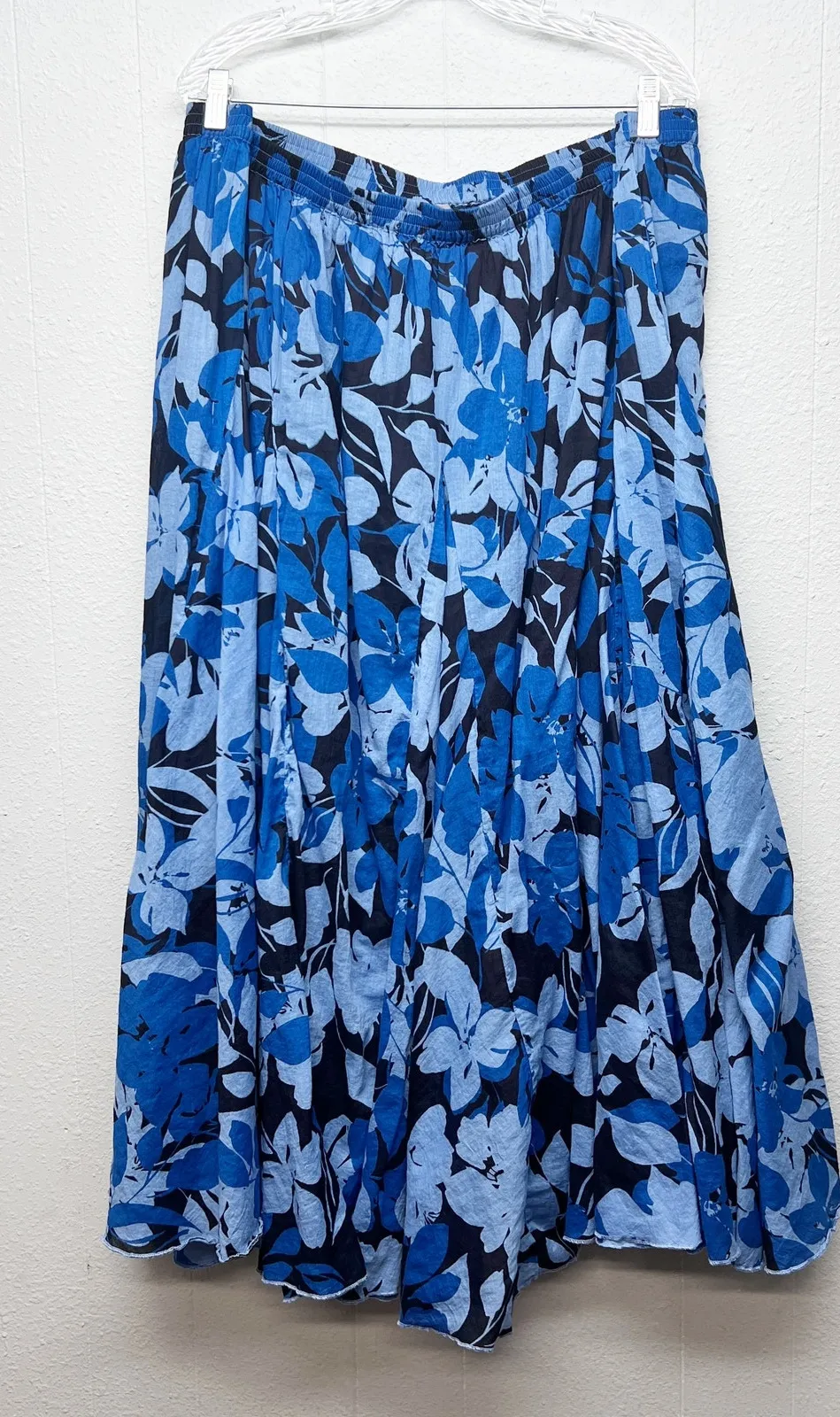 Jessica London women's pull on skirt. Elastic waist. Lined. Dark floral blue & black. Maxi length. Natural & breathable fabric. In good used condition. No stains, tears or holes. 100% cotton. Machine wash. Length: 38" spring summer dark floral forest fairy beachy coastal nautical garden party vacation travel