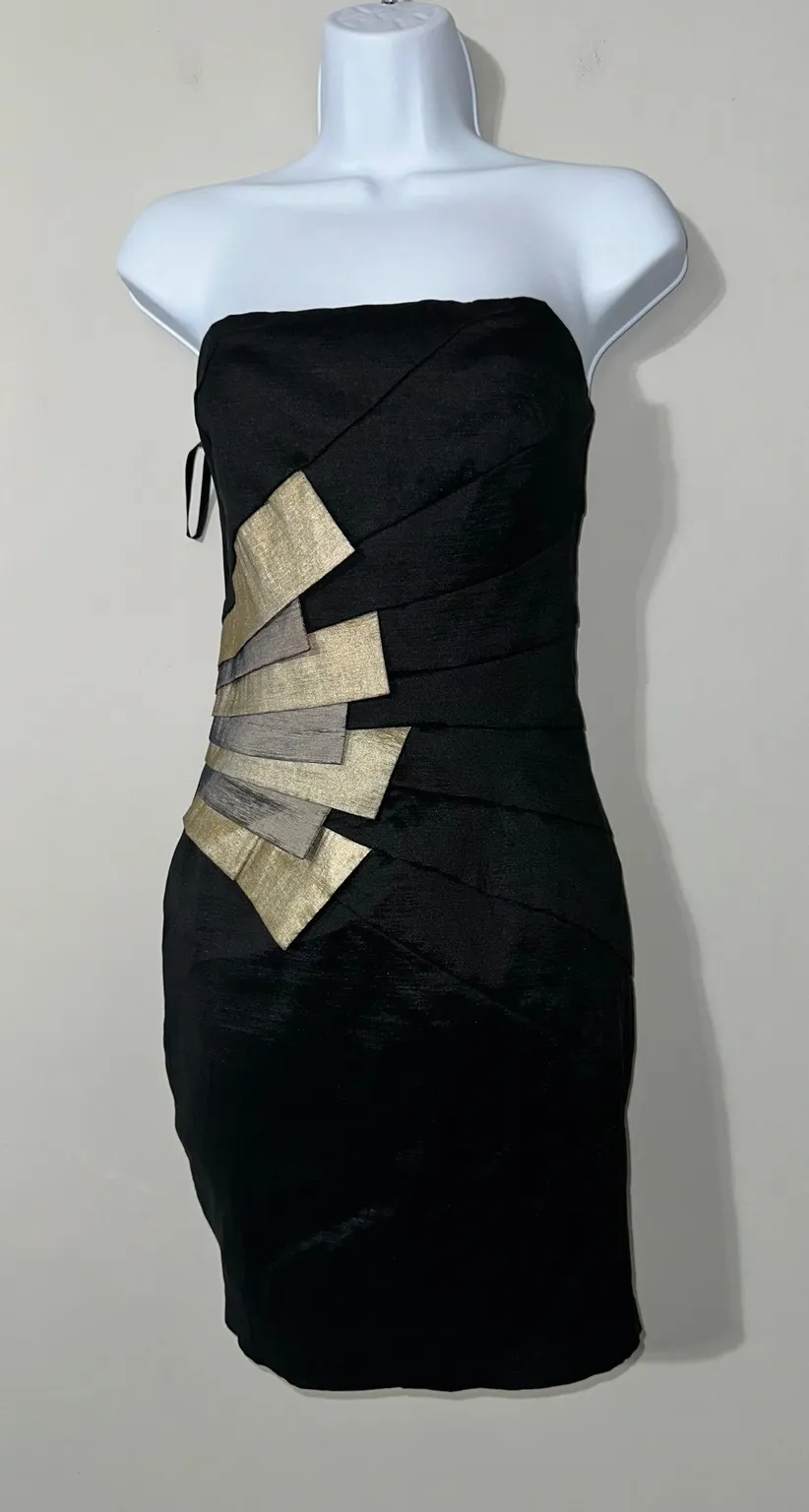 Chic strapless mini dress, featuring a sleek black body and a striking geometric design on the front. This cocktail dress has alternating panels of gold and silver fabrics that create a stylish focal point. The fitted silhouette flatters the figure, while the strapless neckline adds a touch of elegance. With a clean back and a short hemline, this garment has a concealed zipper closure. The dress is fully lined for comfort and structure. Style: Bodycon, Mini Dress Length: Short Color: Black Department: Women Sleeve Length: Sleeveless Pattern: Solid Occasion: Party/Cocktail, Formal Material: Polyester, Nylon, Spandex Neckline: Strapless Character: Party Girl, Elegant, Chic, Glamorous, Cocktail Fabric Type: Satin Season: Fall, Spring, Summer, Winter Keywords: Jessica McClintock dress, black strapless dress, mini dress, party dress, cocktail dress, size 10 dress, gold accent dress, black and gold dress, formal dress, evening dress, special occasion dress, fitted dress, lined dress All pre owned clothing will be cleaned according to care instructions with unscented detergent. All items stored in polybags Comes from a smoke free home