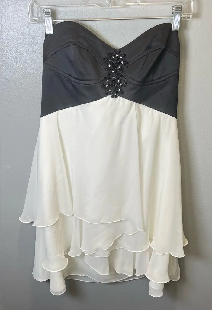 Jessica McClintock for Gunne Sax Black & White Cocktail Dress Size 9 White layered sheer Black satin structured ribbed bodice Beaded rhinestone detail Strapless Approximate Measurements: 16” width top 28” length Fabric is Polyester/Spandex Mix--see tag photo for details. party, wedding, event, semi formal, chic, classy, premium, high end, quality, cocktail, special occasion, prom, homecoming, sorority, holiday, Christmas, vintage, y2k