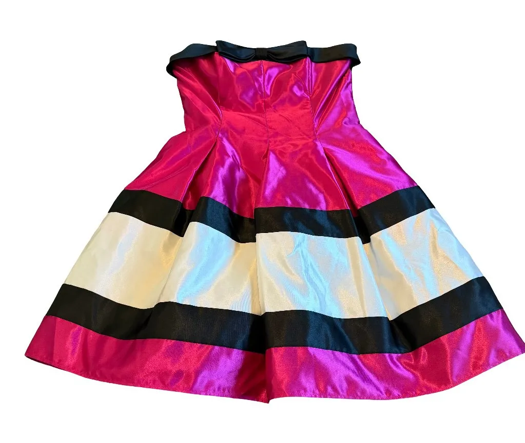 Jessica McClintock for Gunne Sax Size 9 Retro Juniors Sizing = Fits like a size small women's US (see measurements below) Bold bright fuchsia color block stripe dress in mini length Strapless; bow detail at neck Fully lined; Very full skirt Defined waist; Flattering fit 100% polyester Measurements taken across the front when laying flat: Bust: 16", Waist: 14", Length: 29.5" In excellent condition; no stains, holes or flaws I am always open to offers - bundle & save!