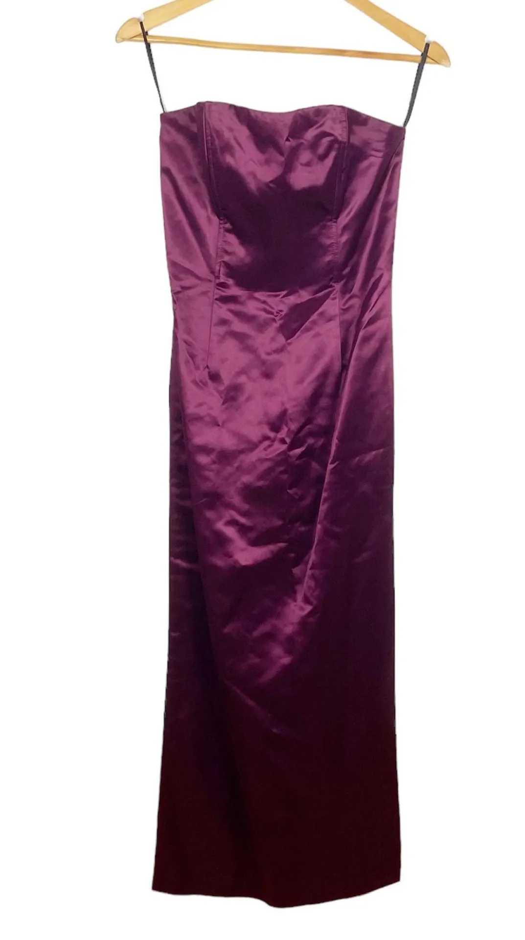 Learn More. Jessica McClintock for Gunne Sax Vintage Strapless Maroon Satin Maxi Dress. Size 5. Sleeveless sheath long formal gown. Boning in bodice. Hidden back zipper closure. Comes in a bit at waistline, and has a long, straight skirt with thigh-high slit on one side. 100% Acetate. Wine/Burgundy. Good preowned condition. Couple of small snags and faint spots. Approximate measurements. 15" underarm to underarm. 47" length.