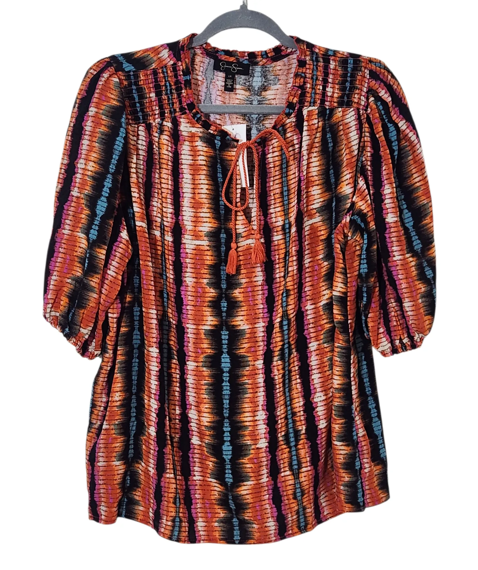 Jessica Simpson blue and orange boho blouse with multicolor stripes and a tie at the front with tassels. Same-day shipping for orders received on weekdays by noon CST. Make me an offer! Measurements shown in images and are taken while laying flat. Condition: new with tags SKU2509-40