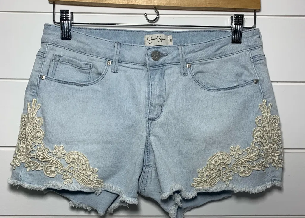 Jessica Simpson Cut off Stretch Blue Denim Almond Lace Short Bottom Size 28 gently worn, great cond... Show more