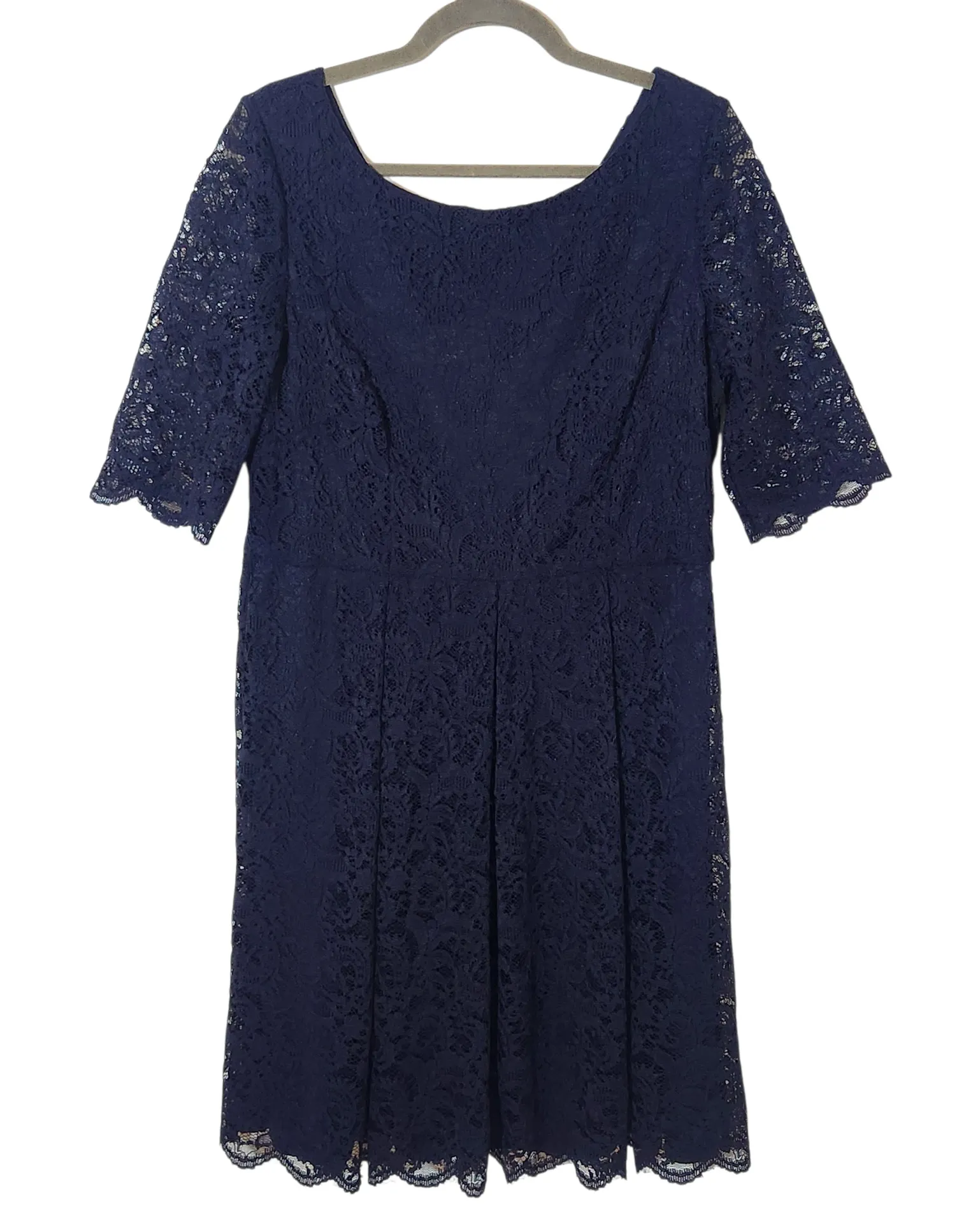 Jessica Simpson elegant navy lace dress with a back zipper and sheer lace sleeves. Falls about at th... Show more