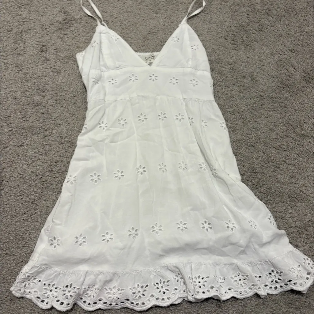 Elegant white dress with floral eyelet design. Ideal for warm days.