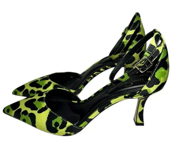 Jessica Simpson Women’s Size 7 Green Black Leopard Satin Foxena Ankle Strap Heels Pumps