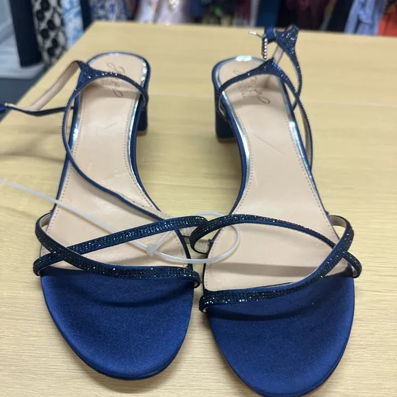 Jewel Badgley Mischka Alexis Slingback Sandal in Blue Size 11 NWOT Dazzling jewel embellishments and crisscrossing vamp straps lend elegant allure to an occasion-ready sandal lifted by a tapered heel. 3" heel Textile upper/synthetic lining/rubber sole Imported