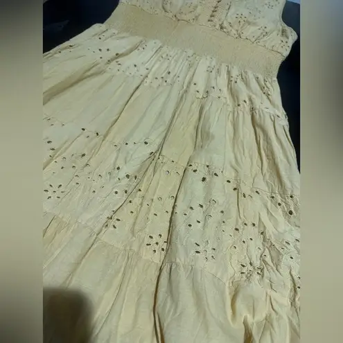 This stunning sundress from features a sleeveless design with a plunging neckline, perfect for casual or resort wear. The dress showcases a tiered and pleated skirt in a warm gold hue, offering a relaxed yet elegant silhouette that falls to mid-calf.