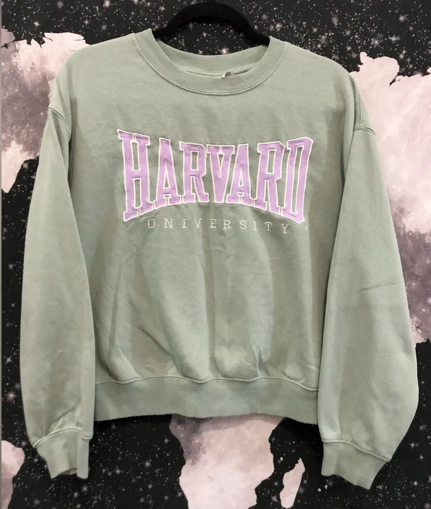 Harvard University collegiate academic scholar campus spell out style crop sweatshirt, color is green with front embroidered school lettering. Preowned condition Sz. Small Measurements (21”x22”)