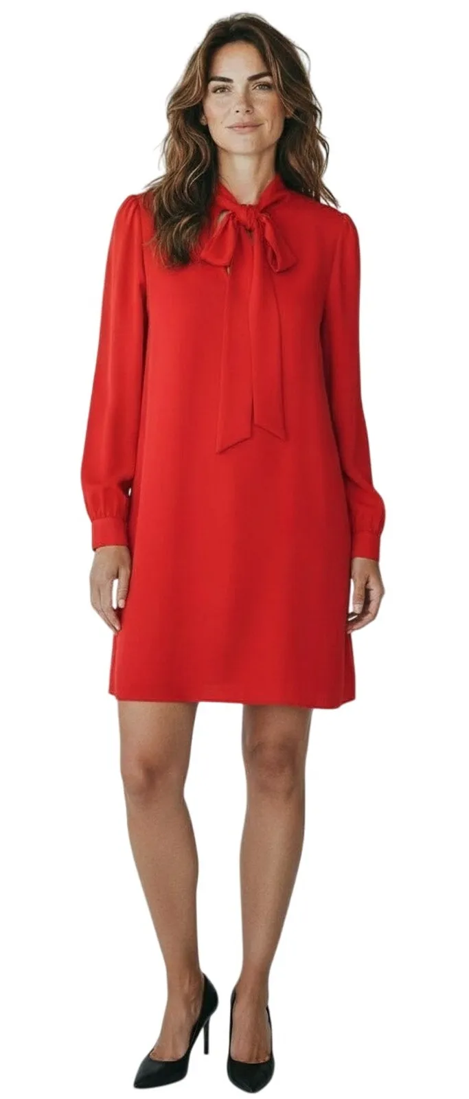 JILL Jill Stuart Women’s Red Bow Tie Long Sleeve Mini Dress Butt cuffs Scoop front neckline Back z... Show more