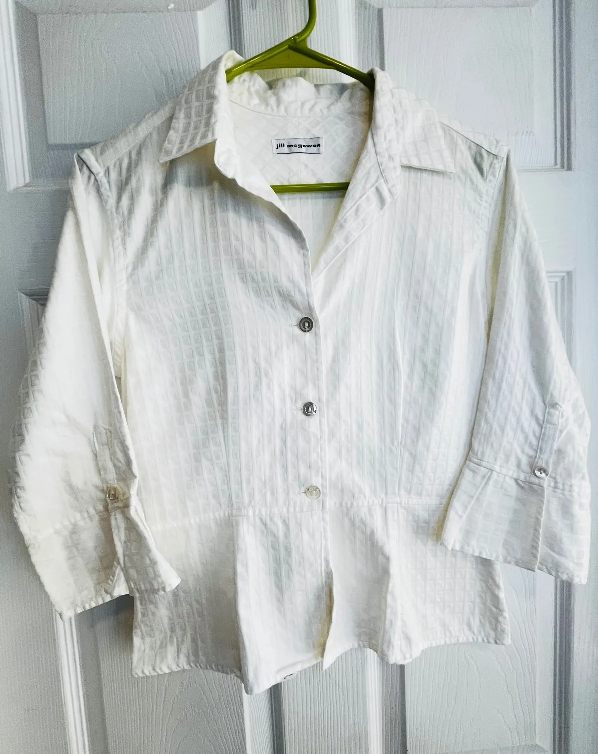 Measurements: • Bust: 17 in • Length: 22 in Size Tag Removed Type: Blouse Department: Women Neckline: Collared Sleeve Length: 3/4 Sleeve Sleeve Type: Roll Tab Sleeve Pattern: Geometric Accents: Button Features: All Seasons Fit: Classic Fabric Type: Woven Occasion: Casual, Workwear Closure: Button Season: Spring, Summer, Fall Unit Type: Unit Keywords: Jill McGowan shirt, white top, textured blouse, peplum shirt, 3/4 sleeve, button down, women's fashion, business casual, smart casual, classic, elegant, workwear, sophisticated Thanks for Looking!