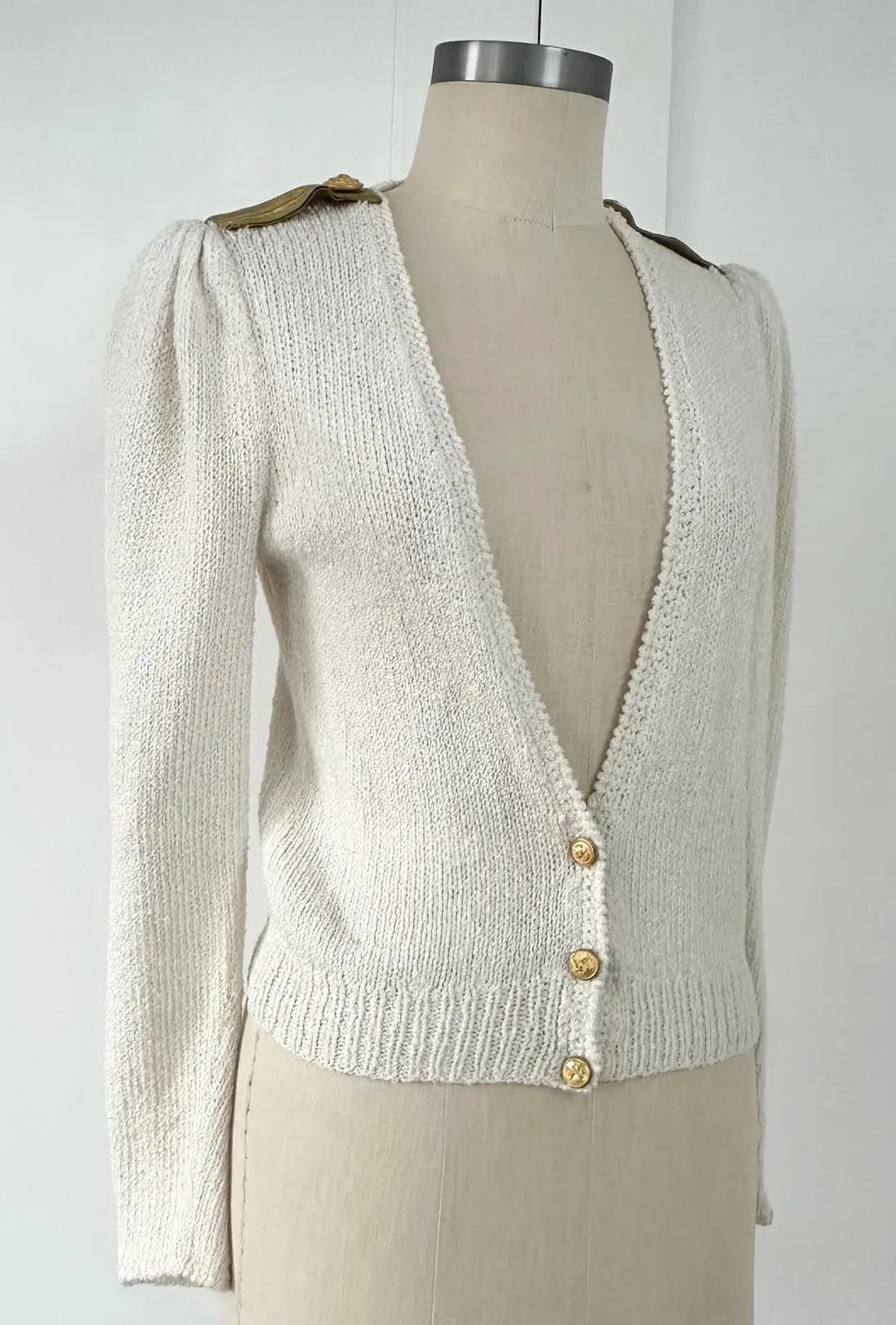 Vintage late 1980s J.J. Orr cream knit cardigan featuring gold crest buttons and military-inspired shoulder epaulettes. Cropped, fitted silhouette with subtle puff shoulders. Classic power-dressing piece with timeless Chanel-adjacent styling. Made circa 1987–1992. Size Small. Fits more like a US XS. Dress form item is shot on is a small US 2-4 for reference Style: Cardigan Department: Women Neckline: V-Neck Theme: Army Sleeve Length: Long Sleeve Type: Sweater Features: Shoulder Pads, Lightweight, Open Pattern: Solid Sleeve Type: Puff Sleeve Fabric Type: Knit Accents: Button Knit Style: Tight-Knit Season: Spring, Summer, Fall Fit: Classic Occasion: Casual, Workwear Keywords: JJ Orr, cream cardigan, knit sweater, gold buttons, shoulder detail, designer knitwear, elegant, sophisticated, layering piece, women's fashion, preppy, classic