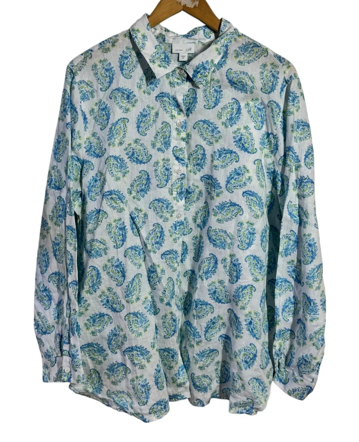 J Jill Love Linen Coastal Button Up Top Women XL White Blue Paisley Preppy Beach Excellent Condition... Show more