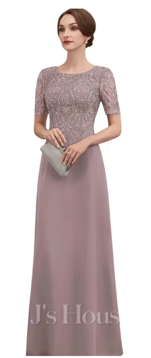 JJ’s House Formal purple Gown A-Line Embroidered Lace Illusion Neckline size M(8-10) Brand: JJ’s House Condition: Great pre-owned condition. Note: The size and care tags have been removed/cut out; please refer to the measurements below for an accurate fit • Elegant A-line silhouette with a flowy chiffon skirt. • Intricate embroidered lace bodice with subtle sequin accents for a touch of shimmer. • Illusion neckline with short lace sleeves • Fully lined for comfort and a smooth drape. • Perfect for Mother of the Bride, Mother of the Groom, wedding guests, or formal evening even