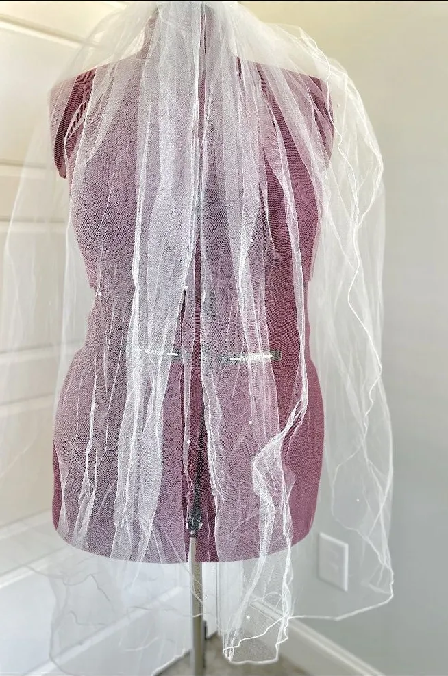 JJs House White Wedding Bridal Pearl Detail Single Layer Fingertip Veil lot V60. Simple, yet very elegant with pearl details. 35" long. Comes with attached comb. In excellent condition. Items typically ship the following business day excluding holidays. Please ask any questions before purchasing. Open to reasonable offers. Comes from smoke free and pet friendly home. All sales final.
