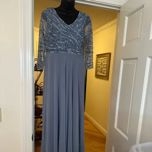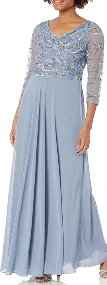 Jkara Slate Blue/Gray 3/4 Sheer Sleeve V Neck Beaded Bodice Dress Size 6P NWT - $49 New With Tags - From Allison