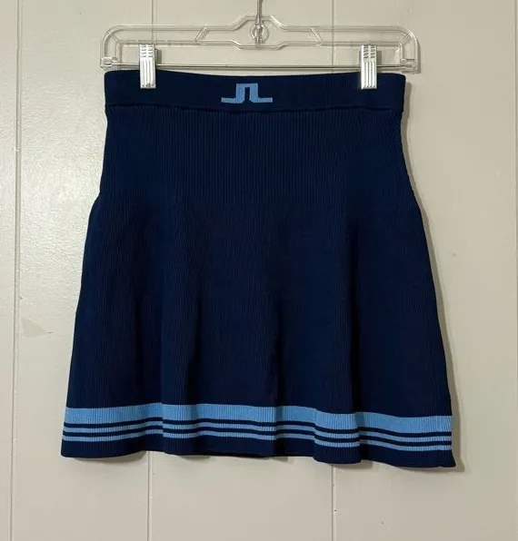 Sporty meets chic with this J.Lindeberg Frida Striped Knitted Skirt in a classic navy blue with light blue stripe detailing at the hem. Designed in a flattering A-line / tennis-style silhouette, this skirt features a comfortable stretch knit waistband and built-in shorts lining for coverage and ease of movement. W:13” L:16” R:8” 65% Viscose 35% Nylon Lining: 92% Polyester 8% Elastane Condition: Good pre-owned condition j lindeberg skirt, frida knit skirt, striped knit skirt, tennis skirt, golf skirt, athleisure skirt, sporty mini skirt, blue striped skirt, luxury activewear, designer athletic skirt, stretch knit skirt, lined tennis skirt