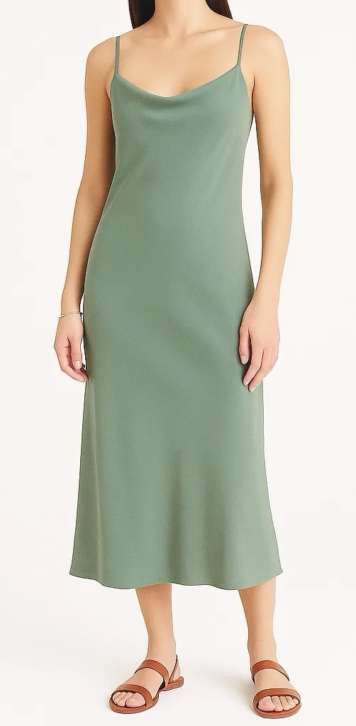 J.Crew, Gwyneth slip dress, green midi dress, cupro blend, sheath dress, minimalist dress, satin slip, 90s style, quiet luxury, wedding guest, date night, cocktail, coastal style