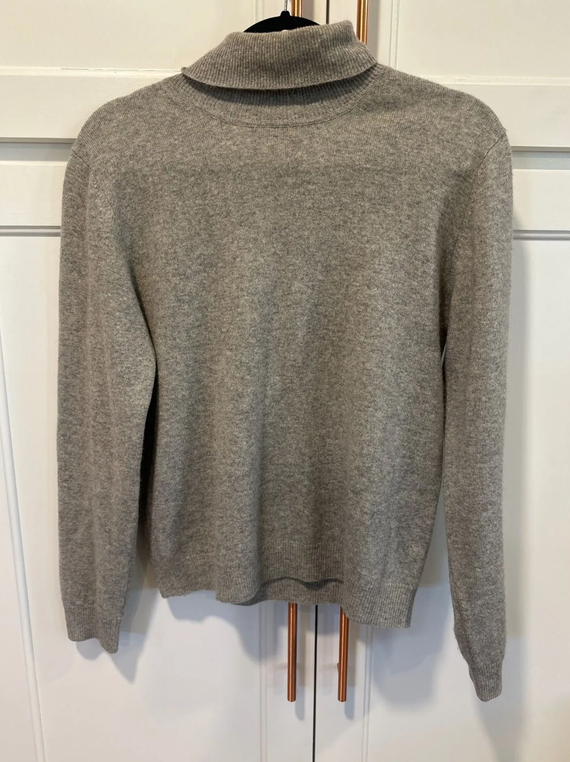 Has one small hole on neck. See picture. Wrap yourself in luxurious comfort with this JM Cashmere 2-Ply Turtleneck Sweater. The soft, light gray hue offers a sophisticated and versatile canvas for your winter wardrobe, while the classic turtleneck design provides both warmth and timeless style. Feel the difference of pure cashmere as it drapes elegantly, creating a flattering silhouette that moves with you. This sweater is perfect for layering under a blazer for a polished office look or pairing with jeans for a relaxed weekend outing. Elevate your everyday style with this essential piece, ideal for chilly days at home or a chic night out. Style: Pullover Department: Unisex Adults Material: Cashmere Neckline: Turtleneck Theme: Classic Sleeve Length: Long Sleeve Type: Sweater Features: Lightweight, Stretch, Breathable Pattern: Solid Fabric Type: Knit Knit Style: Tight-Knit Season: Fall, Winter Fit: Regular Occasion: Casual, Workwear Keywords: cashmere sweater, turtleneck, women's sweater, light gray, cozy, warm, winter fashion, luxury knitwear, classic style, 2 ply, everyday wear, layering piece