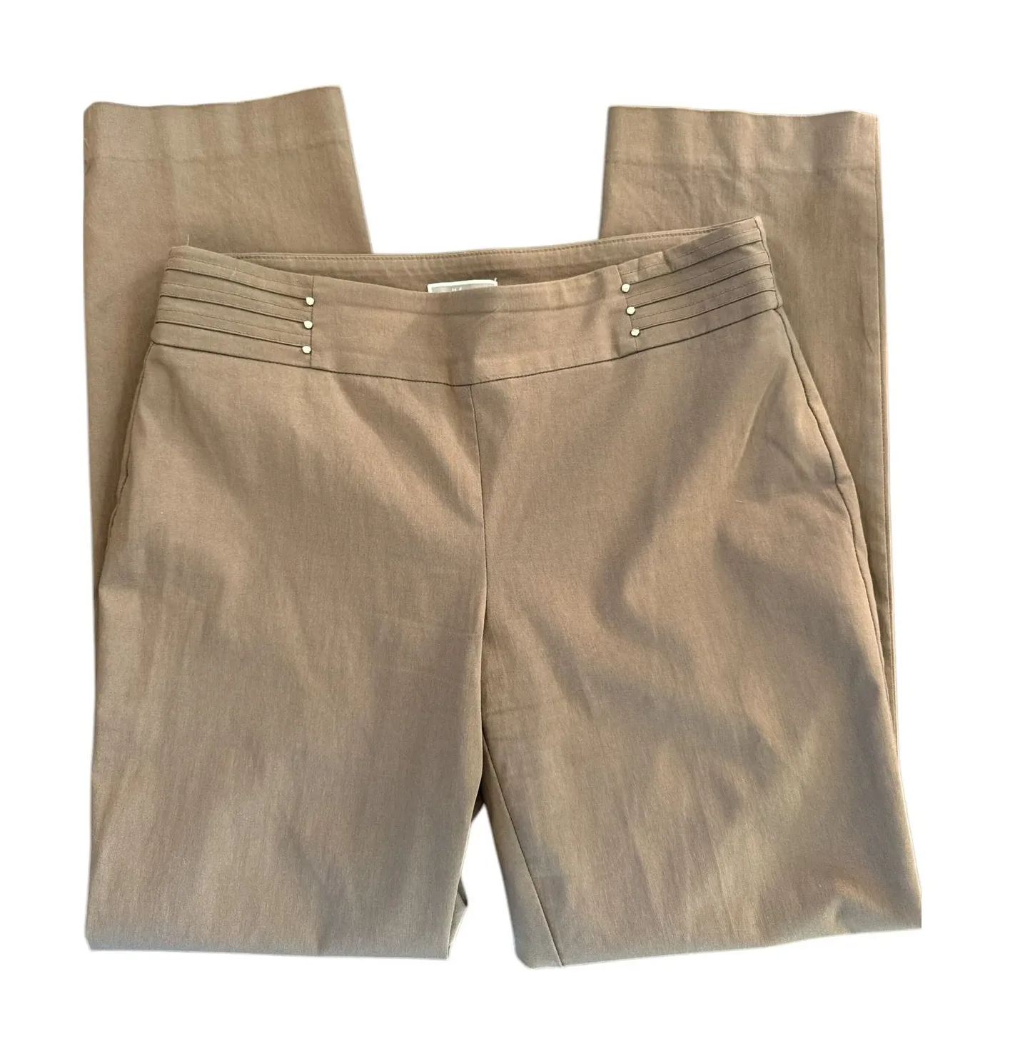 Polished JM Collection stretch trousers in a versatile taupe/khaki-brown. Features a comfy wide waistband with subtle silver-tone stud accents at the hips. Clean straight-leg fit—great for work, travel, or dressing up a casual top. EUC