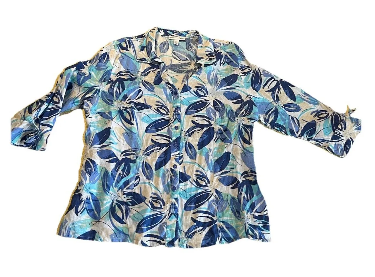 JM Collection Women 20W Shirt Blue White Beige Floral Linen Button Up 3/4 Sleeve - $15 - From Rachelle L