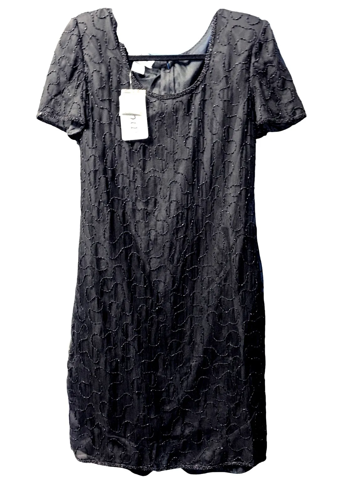 JMD Black Beaded Semi-Sheer Cocktail Party Dress Deadstock vintage silk knee length dress Gorgeous beading on 100% black silk Beaded trim at scoop neck, short sleeve and hem Center back split Shoulder pads Allover squiggle beaded accent Chest 40" Waist 36" Hips 42" Length 39" tagged size XL Gorgeous, dance, special occasion, new year's eve, party, evening out, formal dinner, glam, chic, elegant
