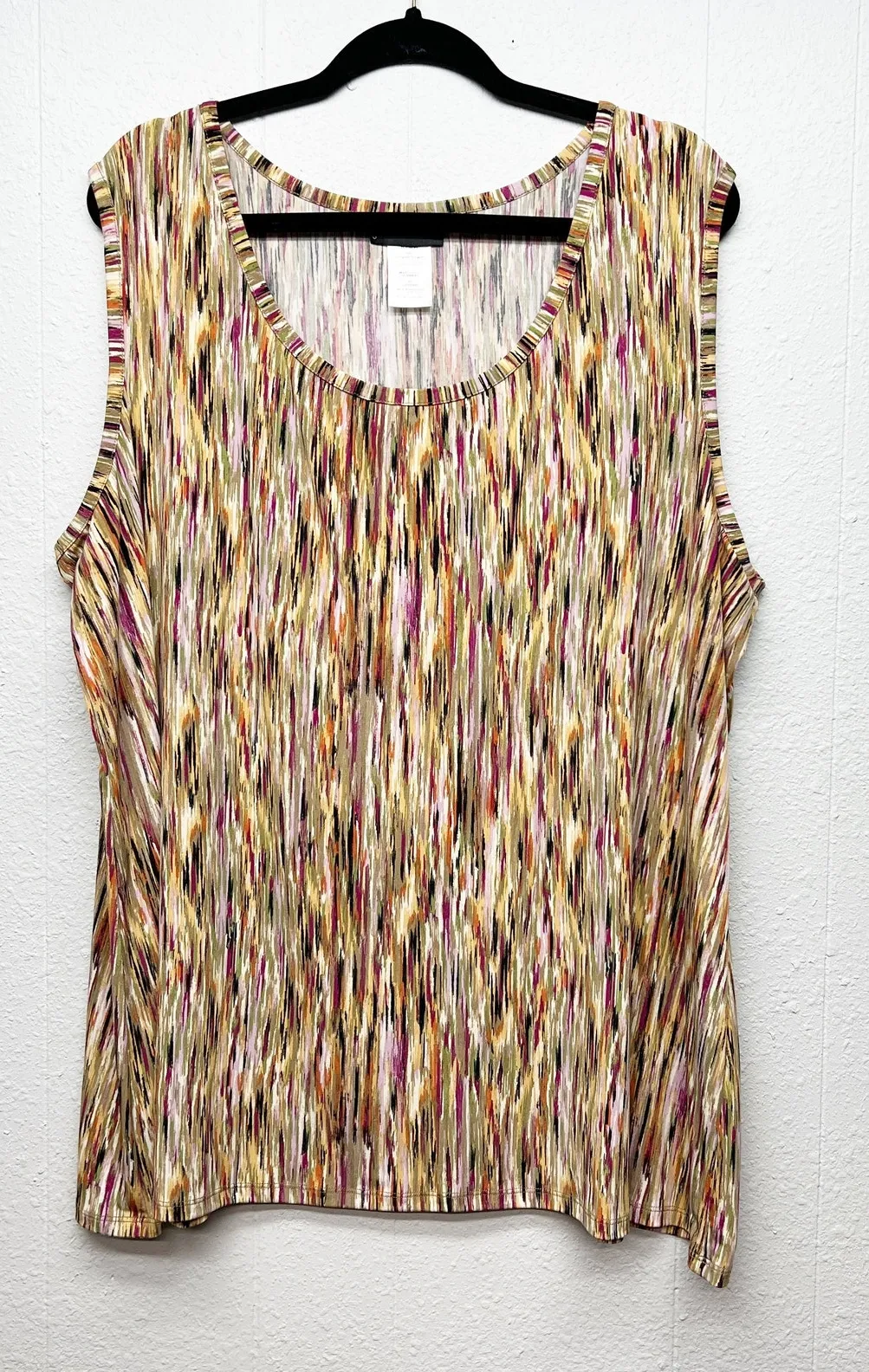 JNS Easy Dressing women's multicolor top. Scoop neck. Sleeveless. Stretch. Art to wear. In good used condition. No stains, tears or holes. Polyester spandex blend. Machine wash. Length: 30"
