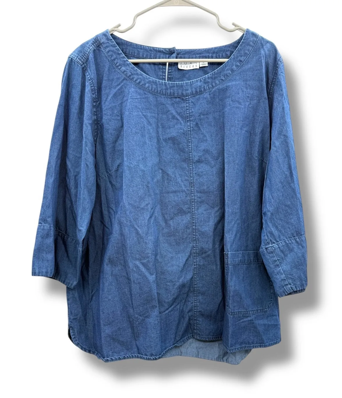 Effortless, polished, and endlessly wearable, this Joan Rivers denim tunic top is a closet staple for casual, everyday styling. Designed with a relaxed silhouette and soft chambray feel, it's perfect for easy layering while still looking put-together. Details: Brand: Joan Rivers Style: Denim / chambray top Color: Medium blue Sleeves: 3/4 length Neckline: Scoop neck Fit: Relaxed, flowy silhouette Features: Front pocket, soft lightweight denim feel Occasion: Casual, travel, weekend wear, work-from-home, layering Size: XL Condition: Good, small run on chest (pictured) Approx. Measurements: • Bust: 23.5 in • Length: 27.5 in Joan Rivers, denim tunic, chambray top, women's XL top, casual tunic, 3/4 sleeve top, relaxed fit blouse, blue denim shirt, pocket tunic, layering top, classic casual, plus size friendly